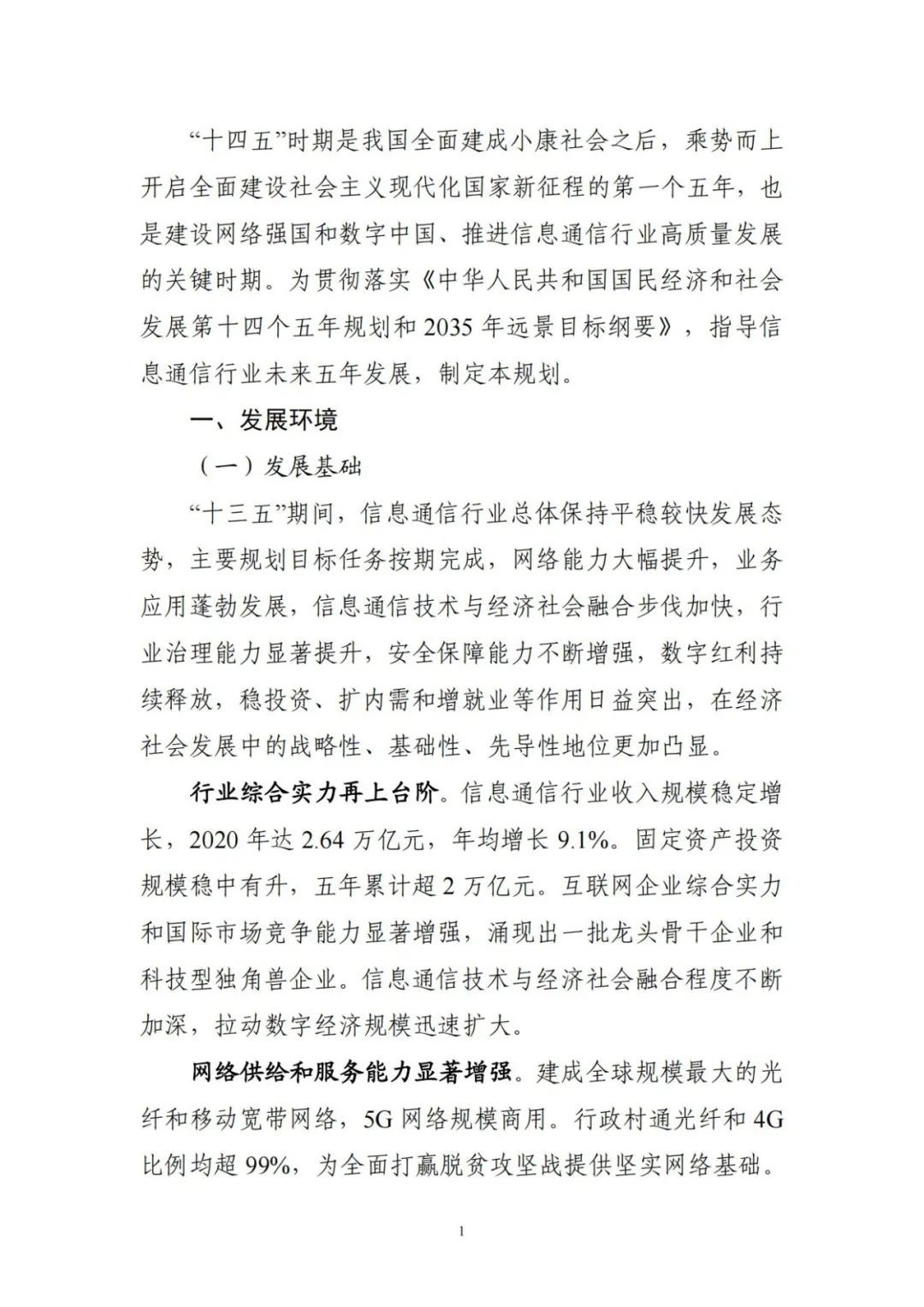 工業(yè)和信息化部關(guān)于印發(fā)“十四五”信息通信行業(yè)發(fā)展規劃的通知